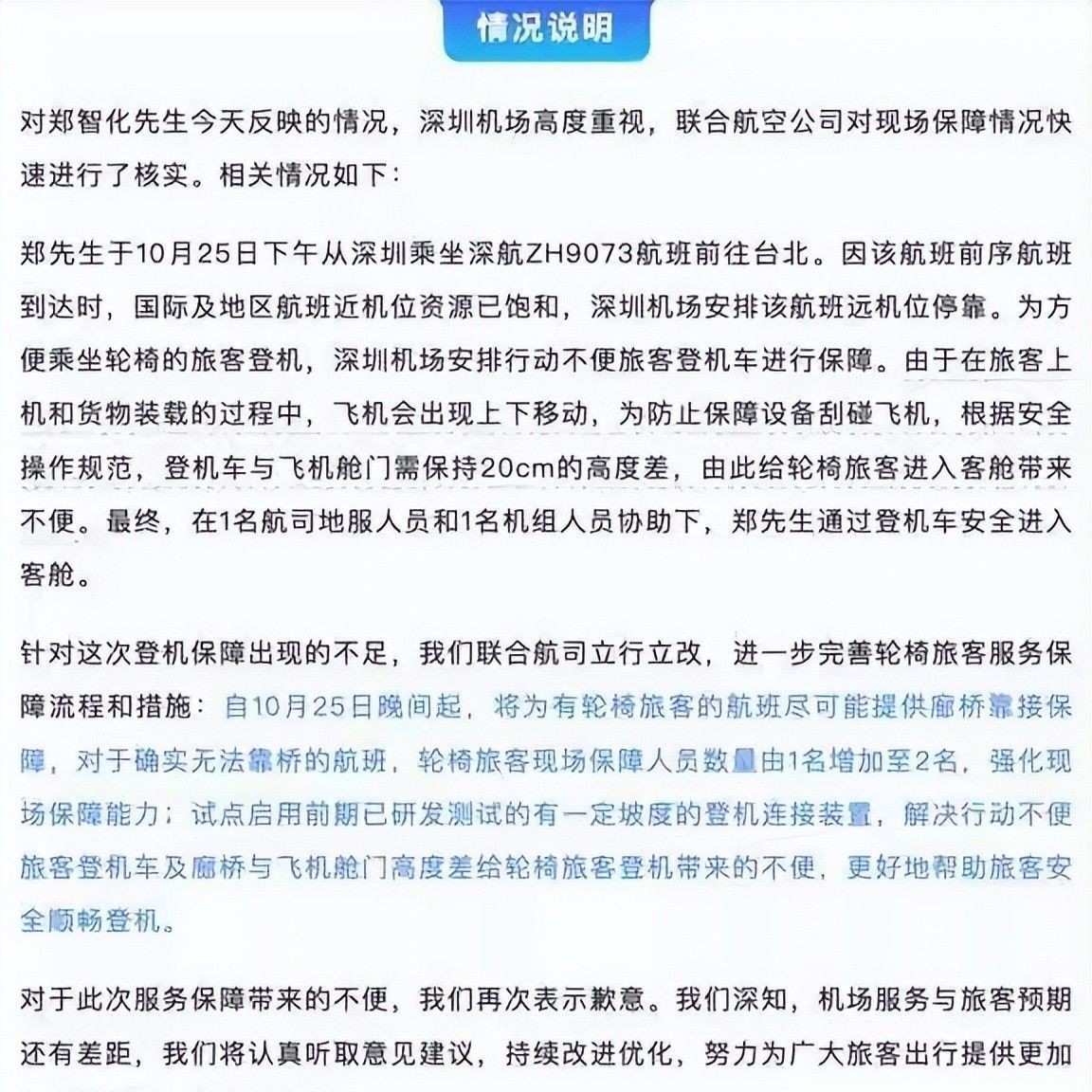 面对机场的诚恳致歉,郑智化表态接受,并宣布不再追究此事责任。