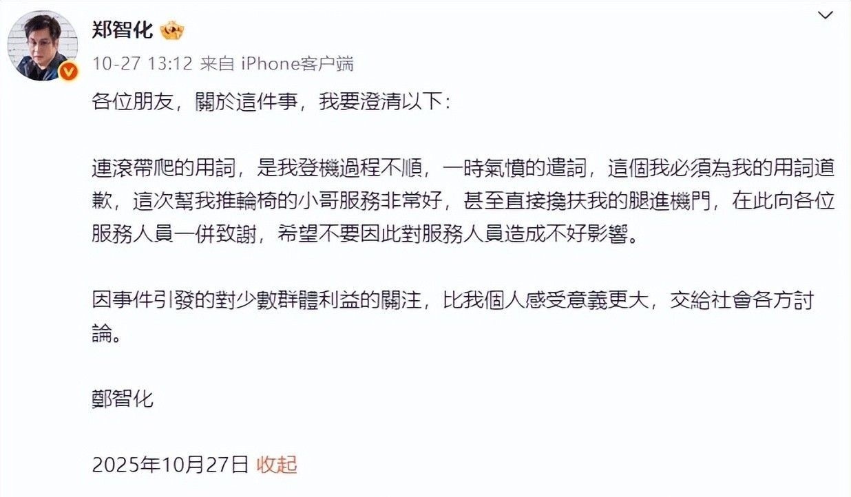 事件爆发两天后,郑智化发布正式致歉信,向深圳机场工作人员表达歉意。