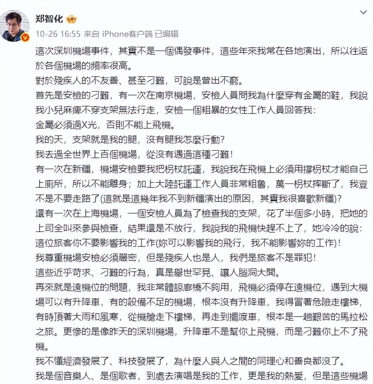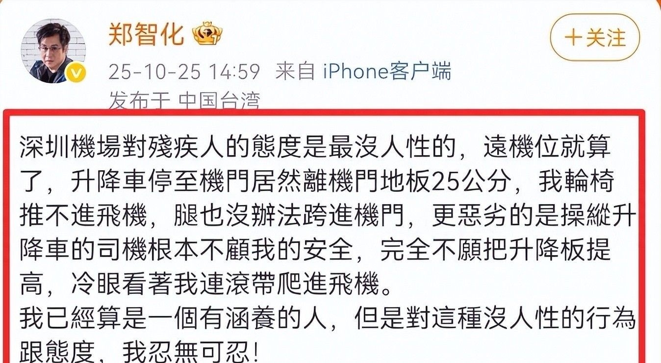 2025年10月25日,久未露面的残疾艺人郑智化突然在社交平台发声,公开批评深圳机场服务缺失。
